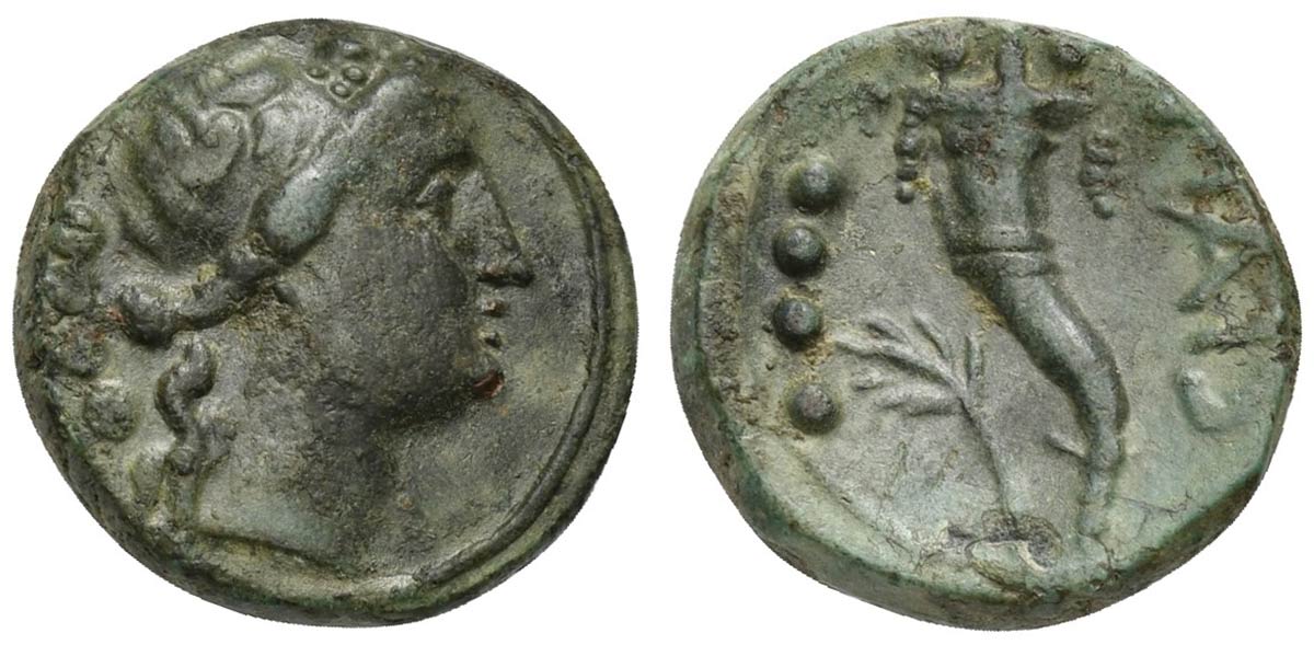 Northern Lucania, Paestum, Triens, ca. 264-241 BC. AE (g 3,61; mm 15; h 12). Female head r., wearing ivy-wreath; at l. four pellets, Rv. PAIS, cornucopiae; at l. four pellets and branch. HNItaly 1216. Green patina and extremely fine.