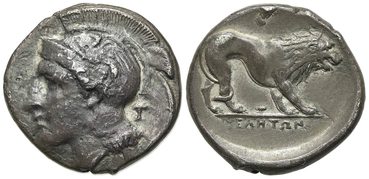 Northern Lucania, Velia, Didrachm, ca. 400-340 BC; AR (g 7.41; mm 22; h 12). T Group. Head of Athena l., wearing crested Attic helmet decorated with griffin; T behind; Rv. Lion standing r.; owl flying above, T below; YEΛHTΩN in ex