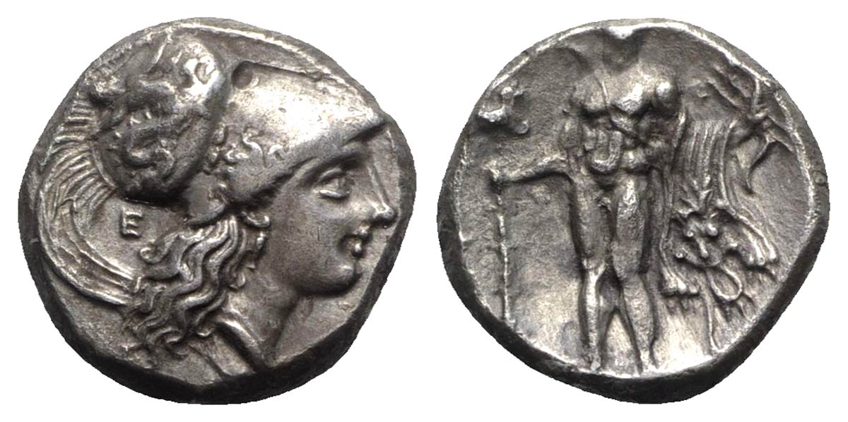 Southern Lucania, Herakleia, Stater, ca. 281-278 BC; AR (19mm, 7.82g, 4h). Head of Athena r., wearing crested Corinthian helmet decorated with Skylla hurling a stone; E behind neck. R/ Herakles standing facing, holding club and bo
