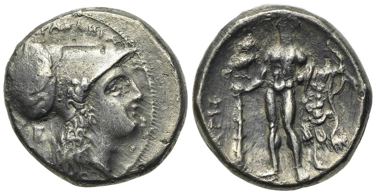 Southern Lucania, Herakleia, Stater, ca. 281-278 BC; AR (g 7.41; mm 20.5; h 2). [|-H]PAKΛHIΩN, Head of Athena r., wearing crested Corinthian helmet decorated with Skylla hurling a stone; E behind neck; Rv. Herakles standing facing