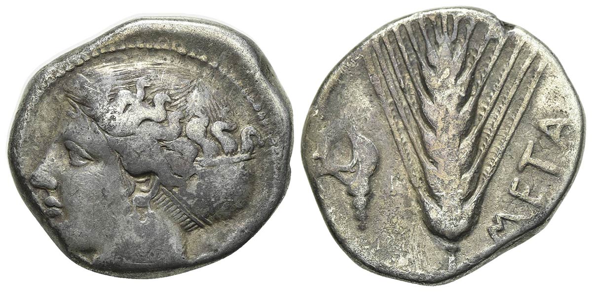 Southern Lucania, Metapontion, Stater, ca. 400-340 BC. AR (g 6,47; mm 20; h 8). Head of Demeter l., wearing barley ear wreath; spray of barley behind, [APIΣTO] on truncation of neck; Rv. META, Barley ear, leaf to l., murex shell a