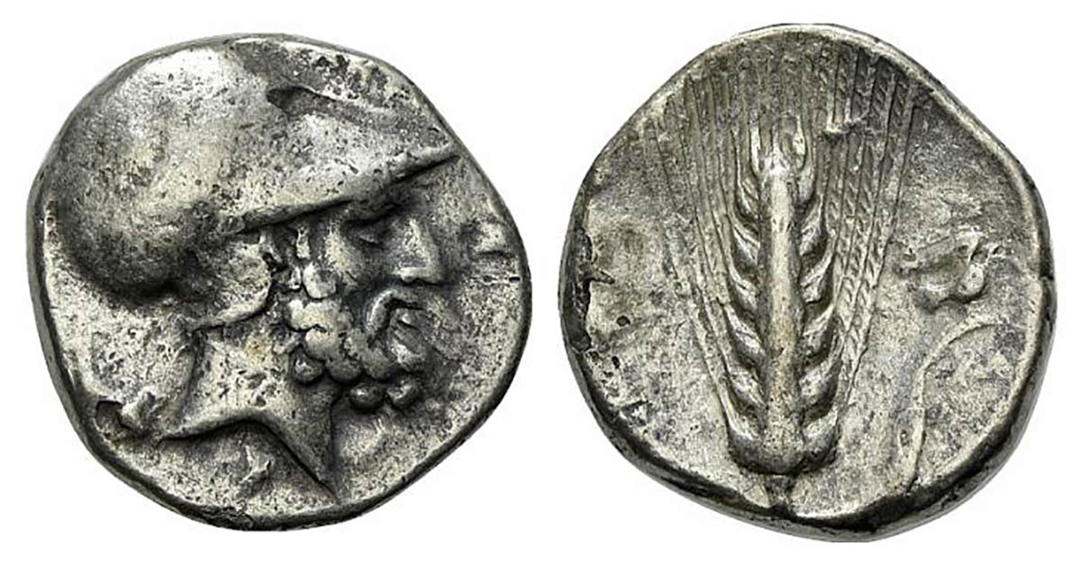 Southern Lucania, Metapontion, Stater, ca. 340-330 BC. AR (g 7,65; mm 21; h 9). Ami-, magistrate. Helmeted head of Leukippos r.; to l., dog seated l.; Rv. [META], Barley ear of seven grains with leaf to r.; above leaf, dove alighting r.; AMI below leaf. Johnston B 3.5; HNItaly 1576. Near very fine