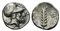 Southern Lucania, Metapontion, Stater, ca. 340-330 BC. AR (g 7,65; mm 21; h 9). Ami-, magistrate. Helmeted head of Leukippos r.; to l., dog seated l.; Rv. [META], Barley ear of seven grains with leaf to r.; above leaf, dove alight