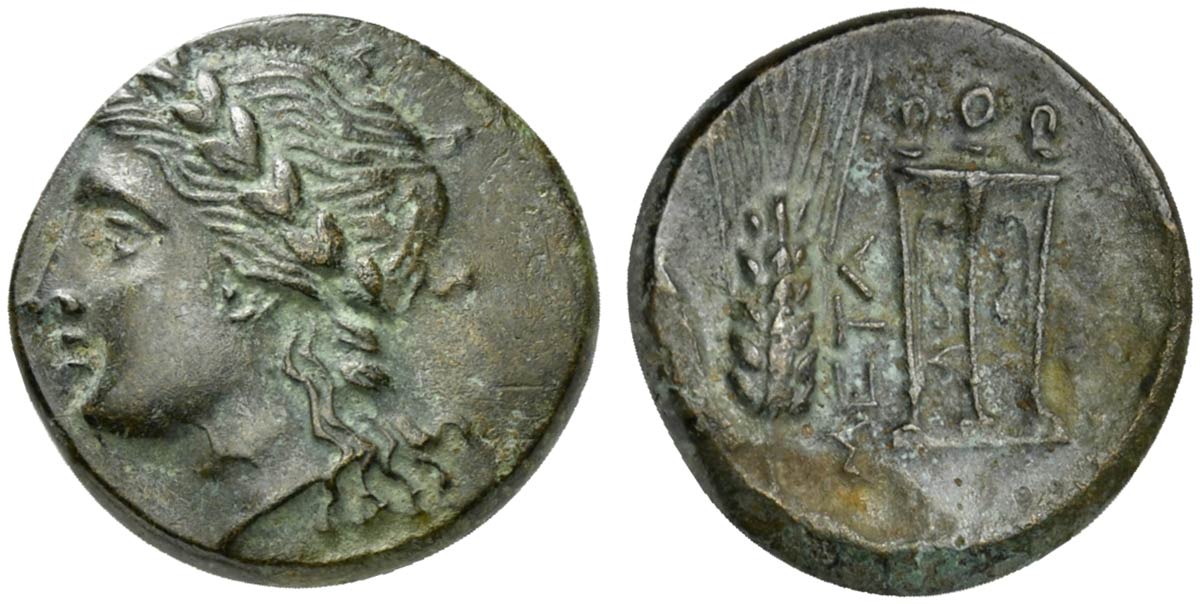 Southern Lucania, Metapontion, ca. 300-250 BC; AE (g 2,71; mm 15; h 2); Laureate head of Apollo l. Rv. META, Grain ear with leaf to l.; tripod to r. Johnston Bronze 40; HNItaly 1675. Green patina, good very fine
