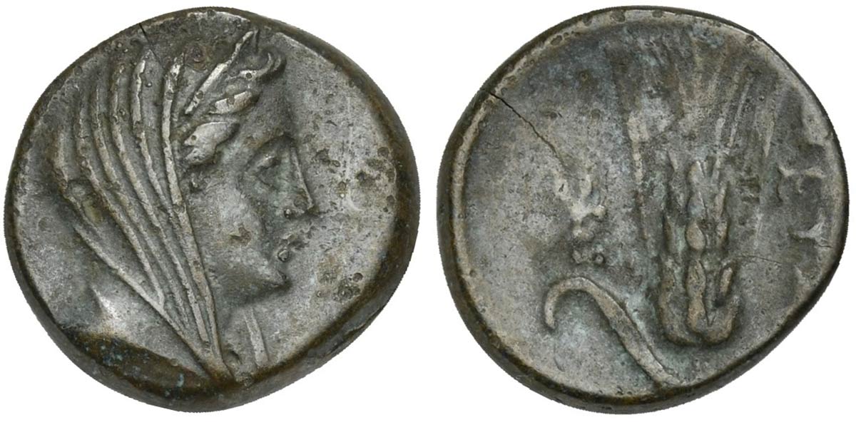 Southern Lucania, Metapontion, ca. 300-250 BC; AE (g 2,69; mm 15; h 3); Veiled head of Demeter r., wearing stephane; Rv. META, Grain ear with bud to l.; monogram to l. Johnston Bronze 57; HNItaly 1693; SNG ANS 573. Very fine