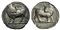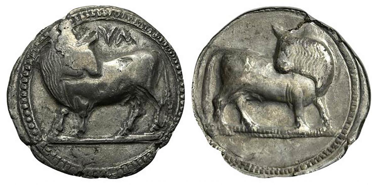 Southern Lucania, Sybaris, Stater, ca. 550-510 BC; AR (g 8,03; mm 30; h 12). VΛ, Bull standing l., looking backwards; above, MV (retrograde); Rv. Same type incuse without legend. HNItaly 1729. Lightly toned, good very fine