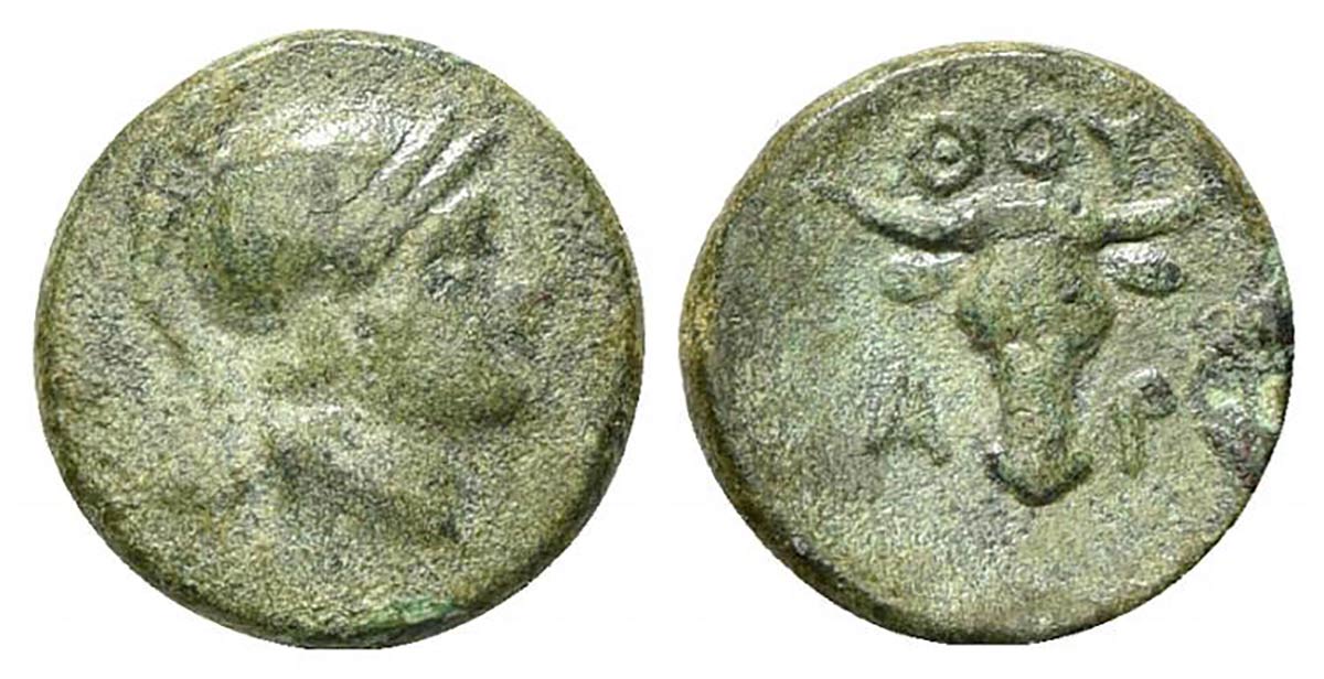 Southern Lucania, Thourioi, after 300 BC; AE (g 0,74; mm 10; h 3). Helmeted head of Athena r.; Rv. ΘOY, Bull head facing; A-P flanking. HNItaly 1922. Green patina, near very fine