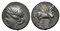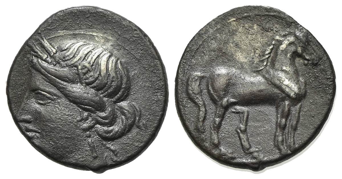 Lotto 155 | Bruttium, Carthaginian occupation, Quarter Shekel, ca. 215-205 BC. AR (g 1.77; mm 14; h 12). Wreathed head of Tanit-Demeter l.; Rv. Horse standing r. HNItaly 2020. Toned, edge chipped, otherwise very fine