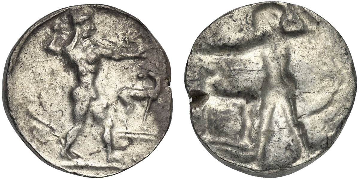 Bruttium, Kaulonia, Stater, ca. 475-470 BC; AR (g 8,12; mm 21; h 12); Apollo advancing r., holding branch; small daimon running r. on Apollo's l. arm; to r., stag standing r., head reverted; Rv. Incuse of obverse, but no daimon an