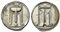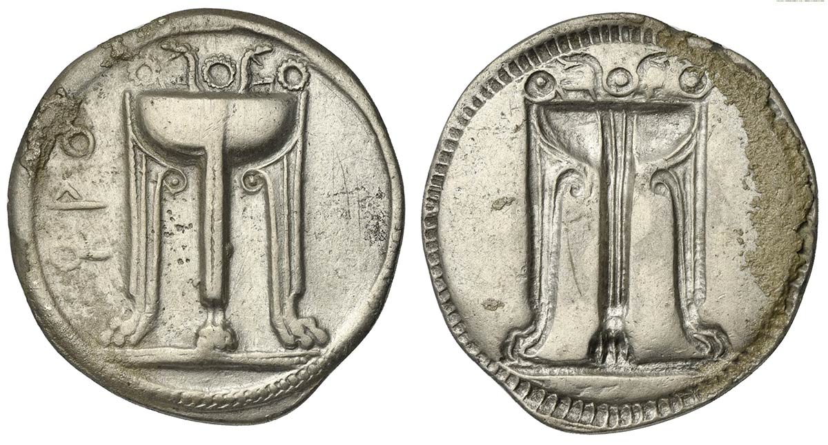 Bruttium, Kroton, Stater, ca. 530-500 BC; AR (g 7,60; mm 30; h 12); ϘPO, Tripod, legs terminating in lion's feet, serpents rising from bowl; Rv. Incuse tripod as obverse. HNItaly 2075; SNG ANS 227-34. Encrustation, good very fine