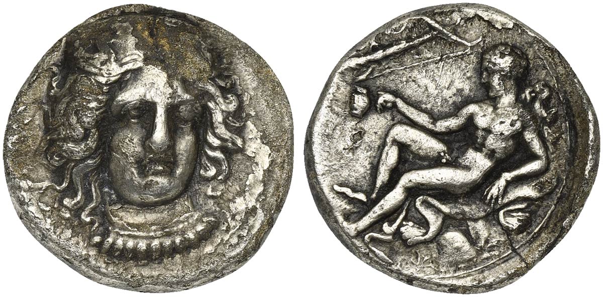 Bruttium, Kroton, Stater, ca. 400-325 BC. AR (g 7,20; mm 20; h 9). Head of Hera Lakinia facing, wearing stephane; on r., KPOTO, Rv. Heracles seated l., holding cup; above, bow and club. HNItaly 2160. Cabinet tone and about extreme