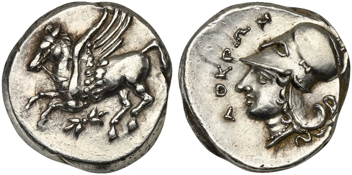 Bruttium, Lokroi Epizephyrioi, Stater, ca. 350-275 BC. AR (g 8,52; mm 21; h 4). Pegasos flying l.; below, thunderbolt, Rv. ΛOKPΩN, head of Athena l., wearing Corinthian helmet with neck guard. Pegasi 13; HNItaly 2342. Lightly toned and extremely fine.
