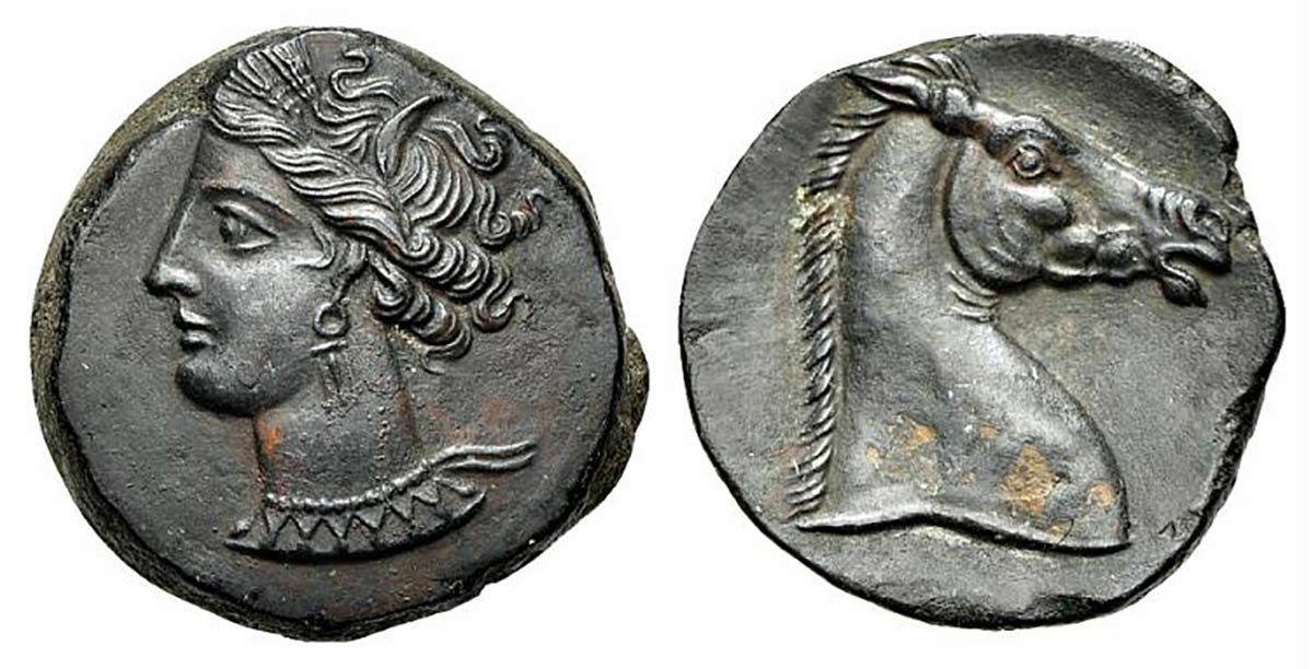 Carthaginian Domain, Sardinia, ca. 264-241 BC; AE (g 5,21; mm 19; h 7). Wreathed head of Kore-Tanit l.; Rv. Head of horse r. Piras 1; SNG Copenhagen (Africa) 149-150. Tooled, extremely fine