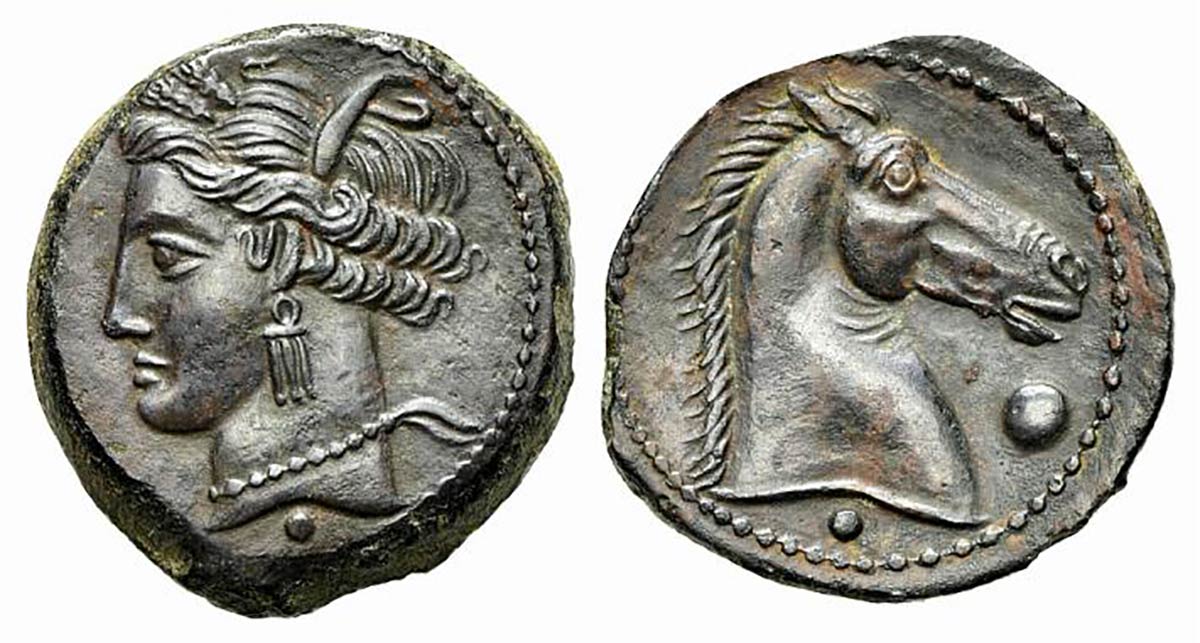 Carthaginian Domain, Sardinia, ca. 264-241 BC; AE (g 4,07; mm 18; h 9). Wreathed head of Kore-Tanit l.; pellet below; Rv. Head of horse r.; large pellet before, small pellet below. Piras 13; SNG Copenhagen (Africa) -. Tooled, extr