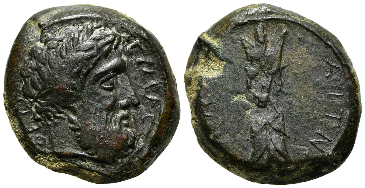 Sicily, Aitna, Hemidrachm, ca. 344-339/8 BC. AE (g 11,23; mm 23; h 3). ZEYΣ EΛEYΘEPIOΣ, Laureate head of Zeus Eleutherios r.; Rv. AITNAIΩN, Upright thunderbolt. Campana 7; CNS 7; HGC 2, 73. Rare, good very fine