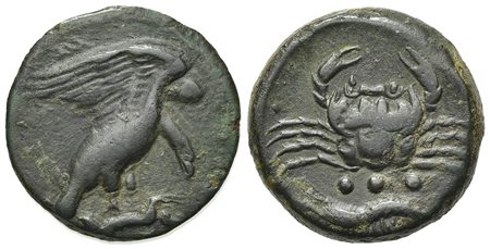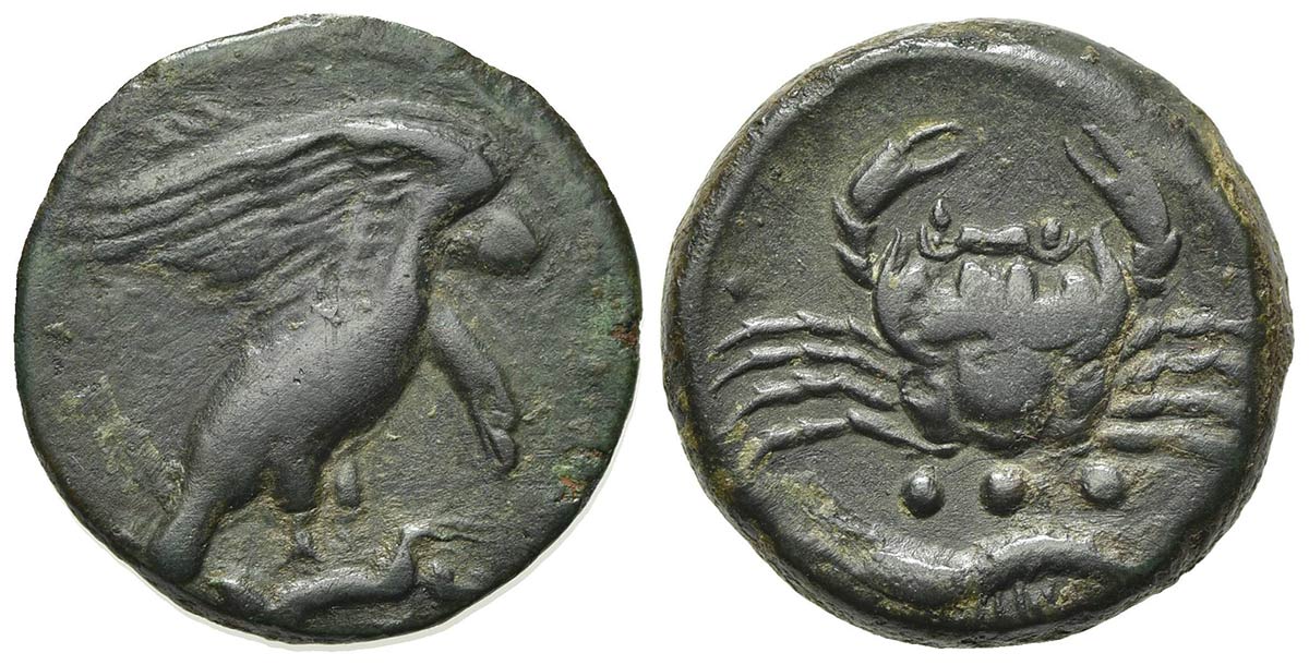 Sicily, Akragas, Tetras, ca. 415-406 BC; AE (g 6,41; mm 21; h 9). Eagle, wings raised, standing r. on, and tearing at, dead hare; Rv. Crab; below, crawfish l. Westermark, Coinage, 836-7; CNS 54; HGC 2, 140. Good very fine