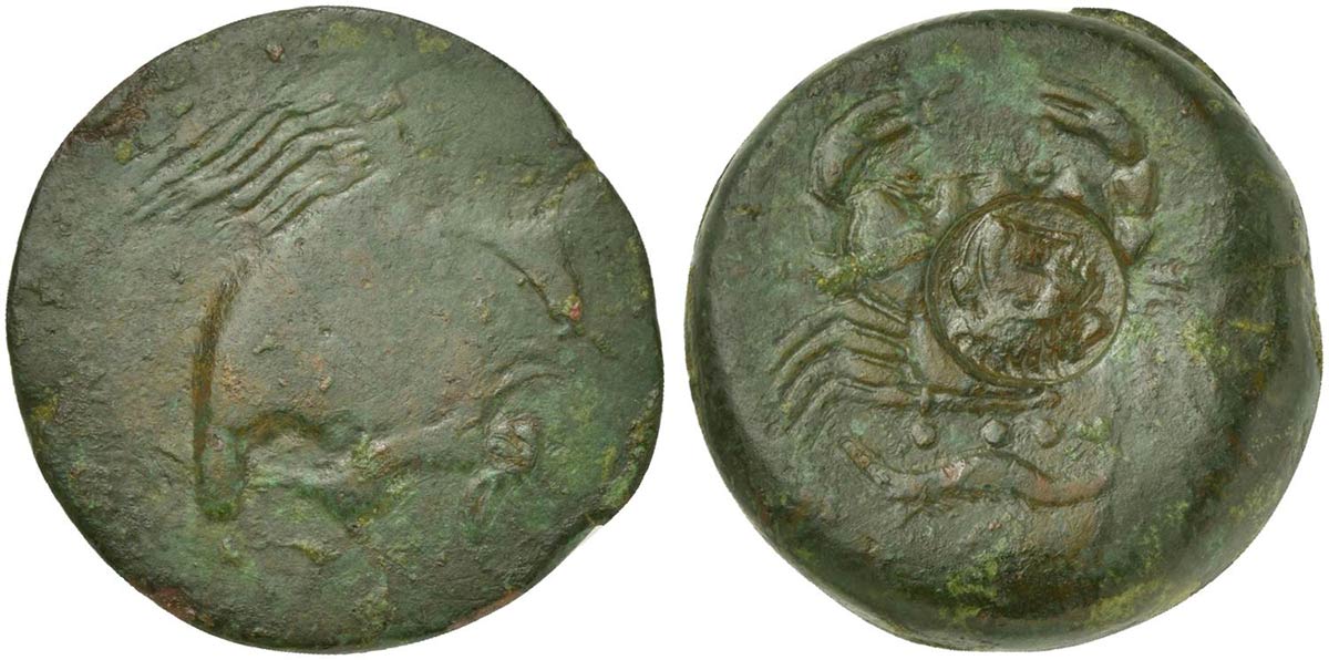 Sicily, Akragas, Tetras, before 406 BC. AE (g 10,91; mm 23; h 6). AKPA, eagle flying r., holding hare with claws, Rv. AKPA, crab; below, three pellets and crayfish l.; c/m: head of Herakles r., wearing lion skin, within incuse cir