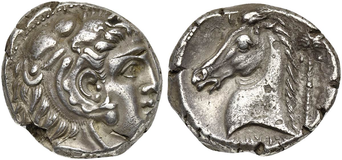 Sicily, Entella, Tetradrachm, ca. 300-289 BC. AR (g 16,51; mm 26; h 10); Head of Herakles r., wearing lion skin Rv. Head of horse l.; palm tree to r., ‘MMḤNT (in Punic) below. Jenkins, Punic 308; HGC 2, 293. Die-breaks, very fine
