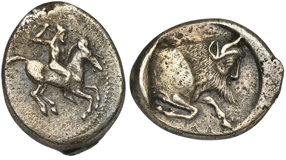 Sicily, Gela, Didrachm, ca. 490/85-480/75 BC; AR (g 8,26; mm 23; h 3); Nude horseman galloping r., brandishing a spear overhead; Rv. [CE]ΛAΣ, Forepart of man-headed bull r. Jenkins, Gela, Group Id; HGC 2, 363. Very fine