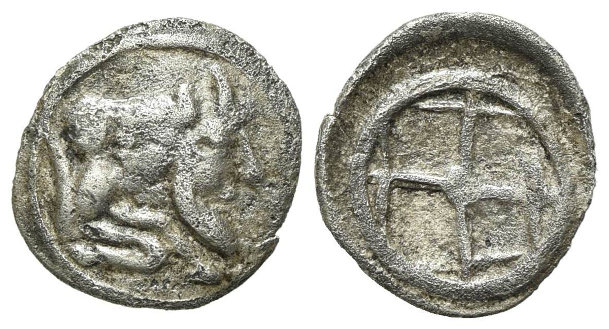 Sicily, Gela, Obol, ca. 480/75-475/70 BC. AR (g 0,38; mm 10). Forepart of man-headed bull r.; Rv. Wheel with four spokes. Jenkins, Gela, 198; HGC 2, 372. Near very fine