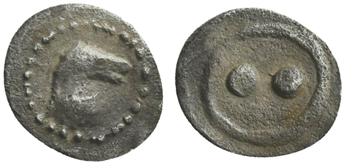 Sicily, Gela, Hexas of Dionkion, ca. 480/75-475/70 BC; AR (g 0,09; mm 5; h 2); Horse’s head r.; Rv. Two pellets (mark of value). Jenkins, Gela Group 2, 199-202; SNG ANS –; HGC 2, 377. Rare, good very fine