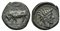 Sicily, Gela, Onkia, ca. 420-405 BC; AE (g 1,16; mm 10,5; h 10); ΓEΛAΣ, Bull standing l., head lowered; barley grain above, three pellets in exergue Rv. Head of the river-god Gelas r., hair flowing behind; grain ear behind. CNS 33