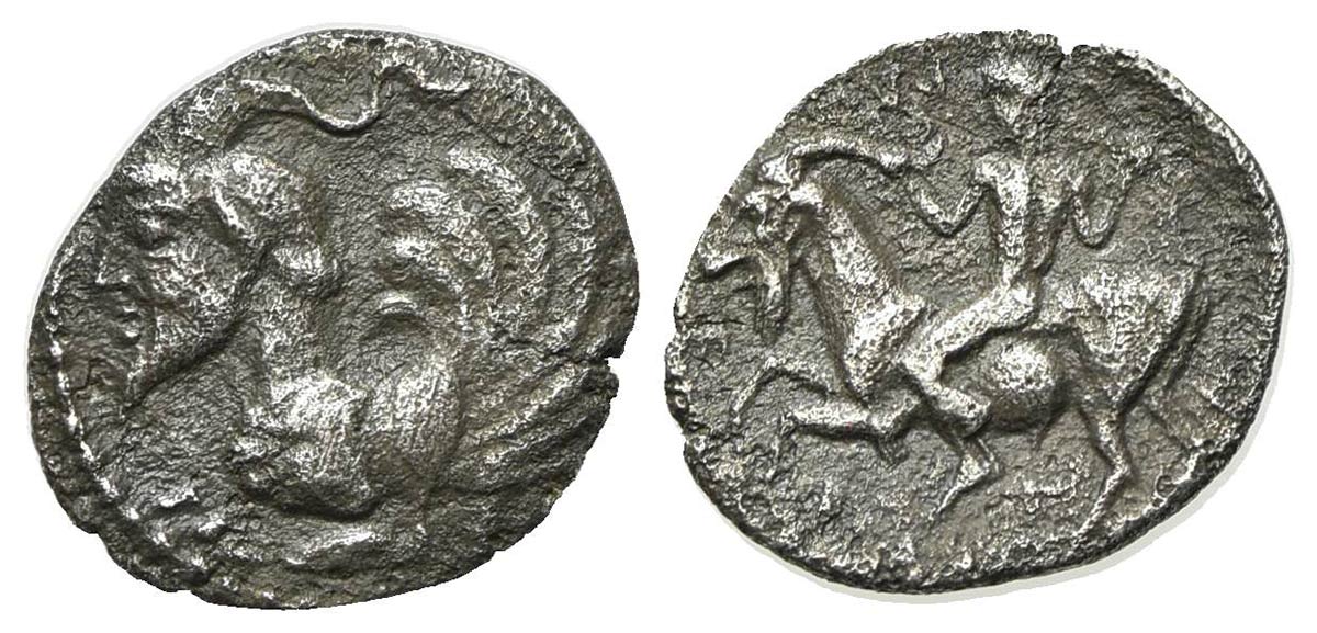 Sicily, Himera, Litra, ca. 430 BC; AR (g 0,66; mm 12,5; h 7). Forepart of human-headed monster l.; Rv. Nude male riding goat l. SNG ANS 172; HGC 2, 451. Porous, very fine