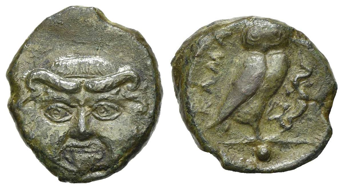 Sicily, Kamarina, Onkia, ca. 420-405 BC. AE (g 1,63; mm 12; h 9). Facing gorgoneion; Rv. KAMA, Owl standing r., head facing, grasping lizard in talons. CNS 2; SNG ANS -; HGC 2, 552. Green patina, very fine