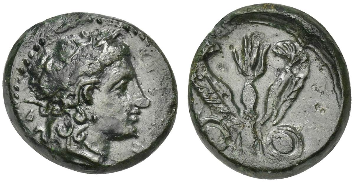Sicily, Kronia, ca 336-317 BC; AE Hemilitron(?) (g 4,39; mm 18; h 3); KPONIA, Wreathed head of Sikelia r.; tiny Δ to l.; Rv. Winged thunderbolt with volutes below; shields flanking. Campana 1; CNS 1; SNG ANS -; HGC 2, 659. Very rare, very fine. Ex Kunker 236 lot 352