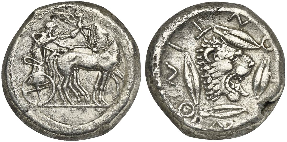 Sicily, Leontini, Tetradrachm, ca. 476-466 BC; AR (g 16,92; mm 24; h 6); Charioteer driving fast quadriga r.; above, Nike flying r., crowning horses; Rv. [ΛE]ONTINON, Head of roaring lion r.; four barley grains around. SNG ANS 203