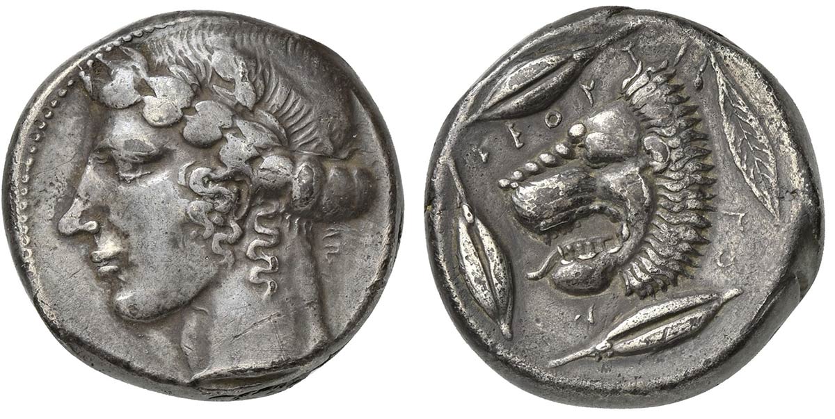 Lotto 304 | Sicily, Leontini, Tetradrachm, ca. 466-405 BC. AR (g 17,24; mm 24; h 6). Laureate head of Apollo l., Rv. LEONT - I - NO - N, head of roaring lion l.; around, three barley grains; behind, leaf. Boehringer, Münzgeschichte 53; SNG AN