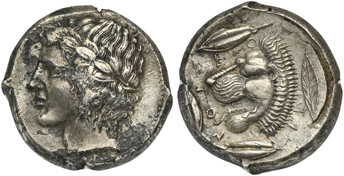 Sicily, Leontini, Tetradrachm, ca. 425 BC. AR (g 17,14; mm 26; h 9). Laureate head of Apollo l., Rv. LEO - N - TI -NON, head of roaring lion l.; around three barley grains; behind, leaf. Boehringer, Münzgeschichte 55; SNG ANS 257. Cabinet tone with iridescent sparkles and about extremely fine.