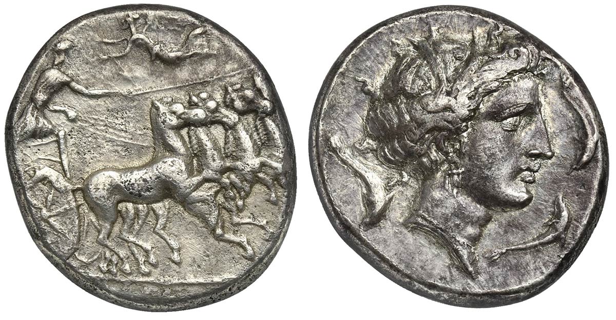 Sicily, Lilybaion (as ‘Cape of Melkart’), ca. 330-305 BC; AR Tetradrachm (g 16,80; mm 26; h 2); Charioteer driving fast quadriga r.; above, Nike flying l., crowning charioteer Rv. Wreathed head of Kore-Persephone r.; four dolphins
