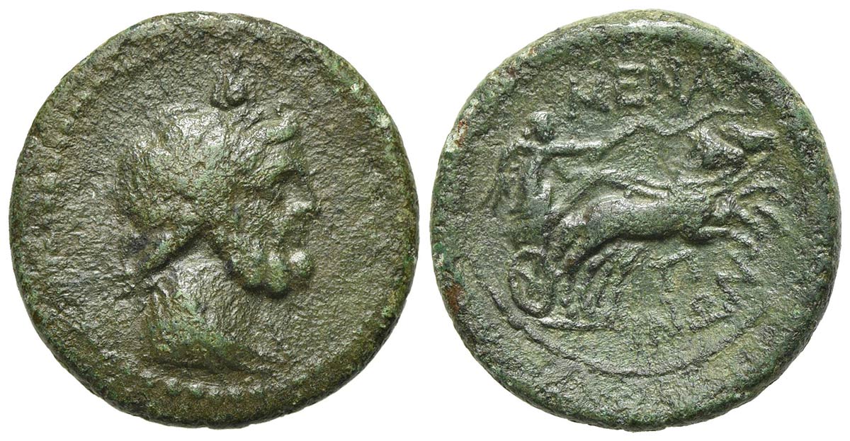 Sicily, Menaion, Pentonkion, ca. 200-150 BC. AE (g 3.79; mm 18.5; h 12). Laureate and draped bust of Serapis r., wearing atef crown; Rv. MENAINΩN, Nike driving biga r.; Π below. Campana 1B/b; CNS 2; HGC 2, 757. Green patina, near very fine
