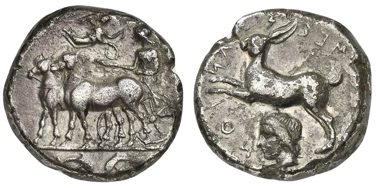 Sicily, Messana, Tetradrachm, 412-408 BC; AR (g 16,03; mm 24; h 11); The nymph Messana, holding reins in both hands, driving slow biga of mules l.; above, Nike flying r., crowning charioteer with wreath held in both hands; two dolphins confronted in exergue Rv. MEΣΣANION, Hare springing l.; below, head of pan l. Caltabiano series XV A, 608; SNG Copenhagen 406; HGC 2, 796. Very fine