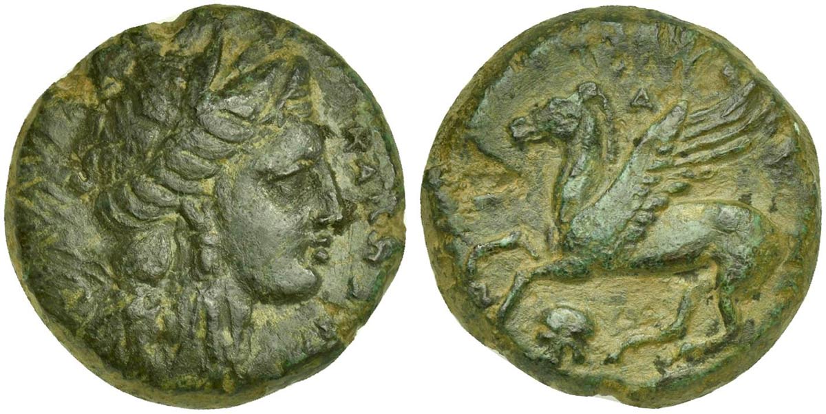 Sicily, Nakona, Bronze, ca. 357-317 BC. AE (g 8,54; mm 20; h 6). ΚΑΜΠΑΝΩΝ, wreathed head of Kore r., Rv. ΝΑΚΩΝΗΣ, Pegasos flying l.; below, helmet. CNS 4. Rare. Green patina and about extremely fine.