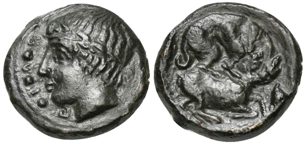 Sicily, Piakos, Tetras or Trionkion, ca. 420-400 BC; AE (g 2,42; mm 14; h 6); Horned and wreathed head of river-god l.; Rv. ΠIAK, Hound attacking stag r.; barley grain to l. and r. Campana 2; CNS 2; SNG ANS -; HGC 2, 1101. Extreme