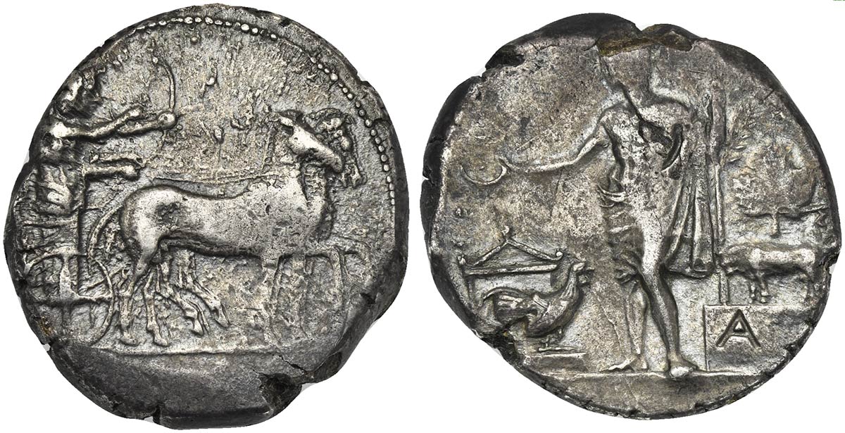Sicily, Selinos, Tetradrachm, ca. 455-409 BC; AR (g 16,79; mm 29; h 7); Artemis, holding reins, driving quadriga r.; beside her, Apollo standing r., drawing bow; barley grain in exergue; Rv. [ΣEΛINONTION], Selinos standing l., holding palm frond and phiale over altar to l.; before altar, cock standing l.; to r., selinon leaf above bull standing l. on basis engraved with an incuse A. Schwabacher 19; HGC 2, 1221. About very fine