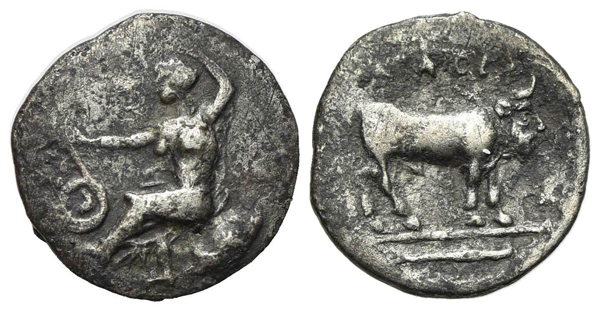 Sicily, Selinos, Litra, ca. 410 BC. AR (g 0.57; mm 11; h 9). Nymph seated l. on rock, r. hand raised above her head, extending her l. hand to touch coiled serpent before her; Rv. Man-headed bull standing r.; in exergue, fish r. SN
