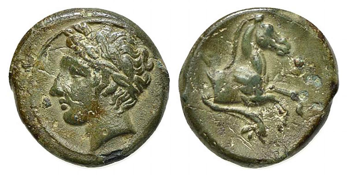 Lotto 362 | Sicily, Soloi (Kefra), ca. 406-397 BC. AE (g 2,64; mm 14,5; h 11). Laureate head of Apollo l.; Rv. Forepart of horse r.; dolphin below. CNS 12H (Panormos-Ziz); HGC 2, 1260. Green patina, near very fine