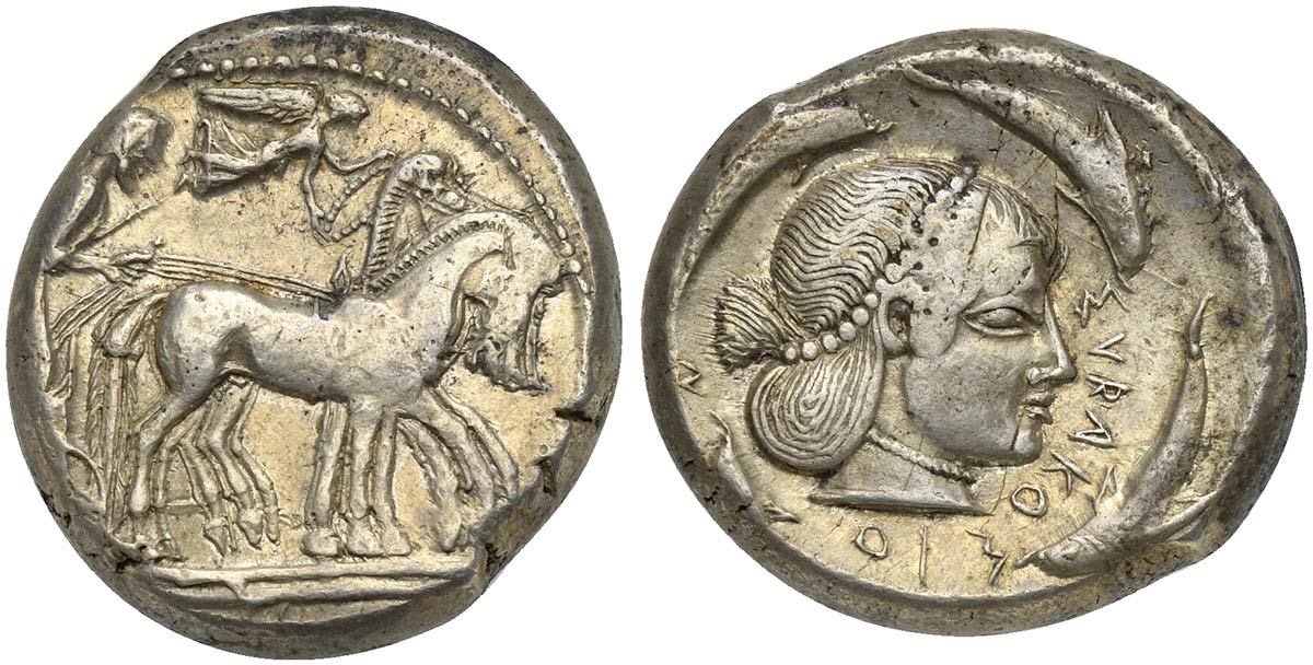 Sicily, Syracuse, Hieron I (478-466); AR Tetradrachm; ca. 478-475 BC (g 17,37; mm 24; h 9); Charioteer driving quadriga r.; above, Nike flying r., crowning horses; Rv. ΣVRAKOΣION, Diademed head of Arethusa r.; four dolphins around. Boehringer 100; HGC 2, 1306. Very fine