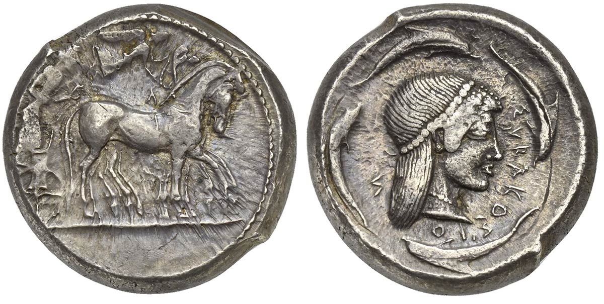 Lotto 370 | Sicily, Syracuse, Hieron I (478-466); AR Tetradrachm; ca. 478-475 BC (g 17,51; mm 24; h 9); Charioteer driving quadriga r.; above, Nike flying r., crowning horses; Rv. ΣVRAKOΣION, Diademed head of Arethusa r.; four dolphins around