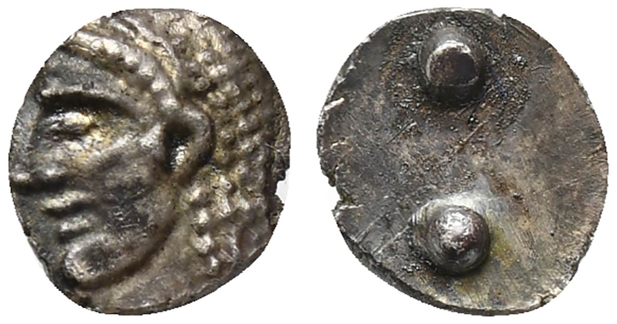 Sicily, Syracuse. Hieron I (478-466 BC); AR Hexas or Dionkion (g 0,12; mm 5; h 12); Diademed head of Arethousa l. Rv. Two pellets (mark of value). Boehringer 373 var. (head r.); HGC 2, 1394 var. (same). Extremely rare, extremely f