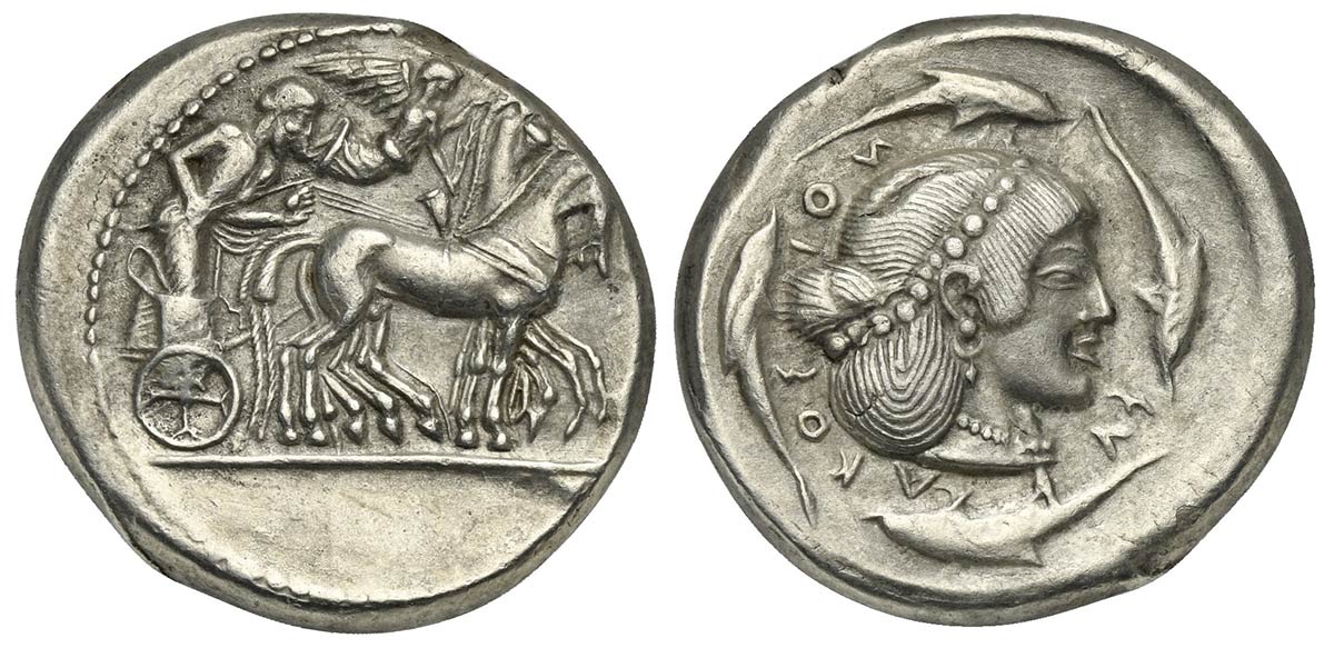 Sicily, Syracuse, Hieron I (478-466); AR Tetradrachm; ca. 480-470 BC (g 16,74; mm 26; h 12); Charioteer driving quadriga r.; above, Nike flying r., crowning horses; Rv. ΣVPAKOΣION, Diademed head of Arethusa r.; four dolphins around. Boehringer 339; HGC 2, 1307. Extremely fine