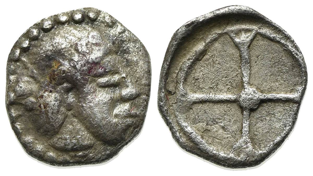 Sicily, Syracuse. Hieron I (478-466 BC). AR Obol; ca. 475-470 (g 0,47; mm 8,5). Diademed head of Arethusa r.; Rv. Wheel of four spokes. SNG ANS 116; HGC 2, 1371. Very fine