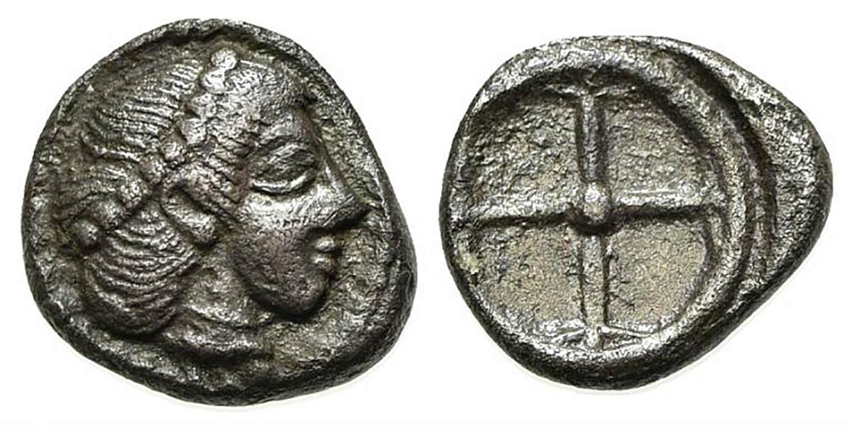 Sicily, Syracuse. Hieron I (478-466 BC). AR Obol; ca. 475-470 (g 0,66; mm 8). Diademed head of Arethusa r.; Rv. Wheel of four spokes. SNG ANS 116; HGC 2, 1371. Very fine