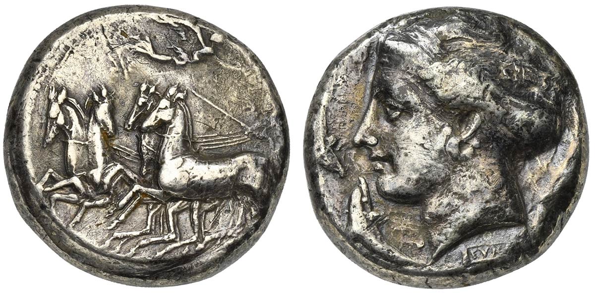 Sicily, Syracuse, Tetradrachm struck under the Second Democracy, signed by Eukleidas, ca. 466-405 BC. AR (g 16,45; mm 23; h 5). Charioteer driving fast quadriga l.; above, Nike flying right crowning charioteer; in ex. grain ear, R