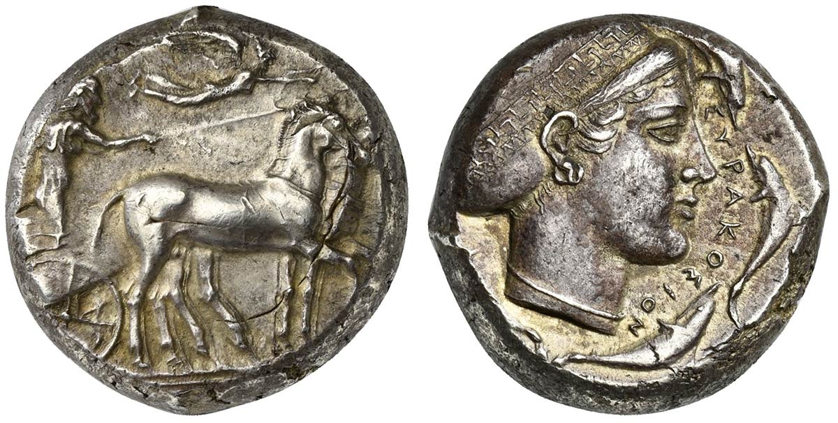 Sicily, Syracuse, Tetradrachm struck under the Second Democracy, ca. 430 BC. AR (g 17,50; mm 22; h 3). Charioteer driving slow quadriga r.; holding kentron and reins; above, Nike flying r., crowning horses, Rv. ΣVPAKOΣION, head of Arethusa r.; around, four dolphins. Boehringer 642 (V326/R442); SNG ANS 207 (same dies). Lightly toned and extremely fine.