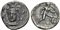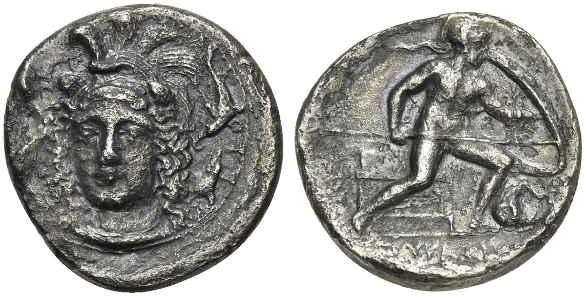 Sicily, Syracuse, Dionysios I (405-367 BC); Unsigned dies in the style of Eukleidas, c. 405-400 BC; AR Drachm (g 3,41; mm 17; h 5); Helmeted head of Athena facing slightly l.; four dolphins swimming around Rv. The hero Leukaspis a