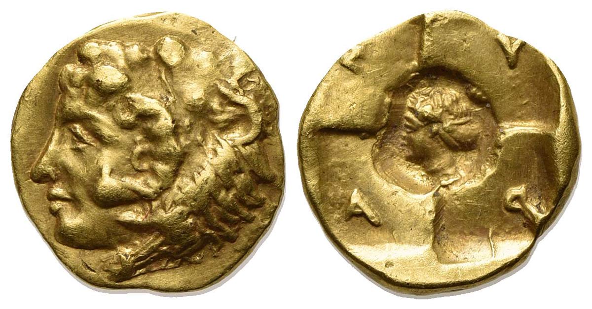 Sicily, Syracuse, 20 Litrai struck under Dionysios I, ca. 405-367 BC. AV (g 1.11; mm 9.5; h 4). ΣYPA, head of Herakles l., wearing lion skin, Rv.Quadripartite incuse square, Σ-Y-P-A in quarters; in deeper incuse circle in center, small female head (Arethousa?) l. Bérend pl. XI, 3; Boehringer, Münzprägungen, pl. I, 6; HGC 2, 1289. Good very fine
